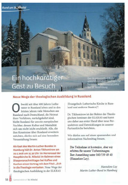 Pastor i.R. Norbert Hintz, der Vorsitzende des Martin-Luther-Bundes Hannover wird uns besuchen und über seine Tätigkeit als Bischofsvikar in der ELKER, der Evangelisch-Lutherischen Kirche im Europäischen Rußland, berichten. Gerade in einer Zeit, in der besonders viel über Rußland und seine Nachbarn in den Medien berichtet wird, ist es sehr interessant , einen Blick ins Innere des Landes aus lutherischer Sicht zu richten.